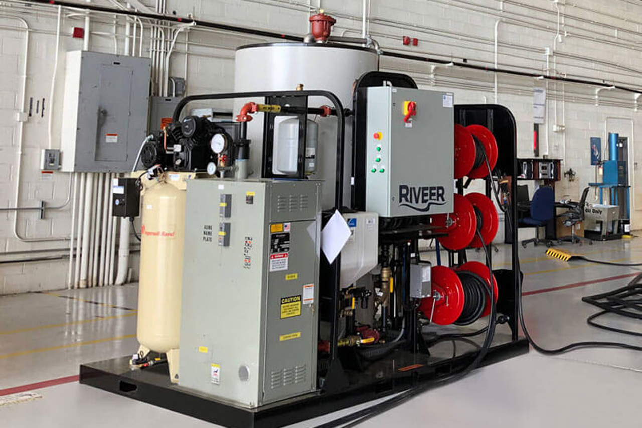 The in-hangar design delivers fully electric operation using existing hangar power and water connections, eliminating the need for costly modifications or ventilation systems. This mobile system enables year-round corrosion control without the safety concerns of diesel equipment in enclosed spaces.