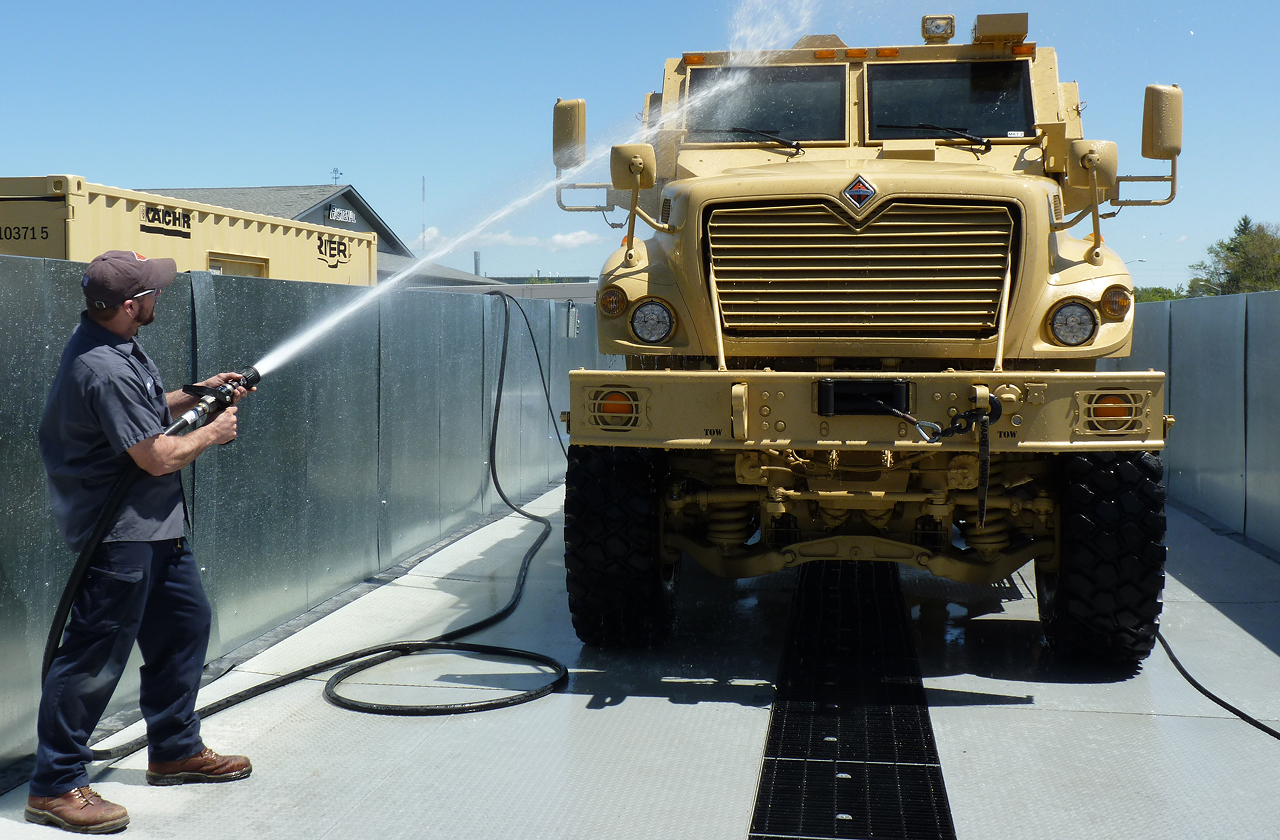 The Military Vehicle Wash System (VWS) operates in military locations worldwide and is tailored to your custom specifications. This deployable wash system provides complete undercarriage access for washing and inspection, while capturing wash water for proper disposal in accordance with DoD environmental regulations.